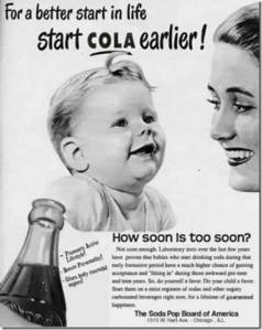 “Babies who start drinking soda have a higher chance of ‘fitting in’ during those awkward pre-teen years. Start them on a strict regimen of cola and other sugary carbonated beverages right now, for a lifetime of guaranteed happiness!”
