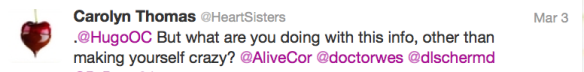 Good point – I liked your example of purposeful tracking, as opposed to keeping track of something just because you can. Yours was more like sleuthing: something must be causing these symptoms, my doc’s not taking it seriously, let’s see if I can present him/her with some data to “prove” I’m not just making this stuff up so we can get to the bottom of this medical mystery together.