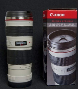 I’ve picked up lots of corporate swag at conferences and trade shows during my PR days, but free ballpoint pens or cheap fridge magnets can hardly compete with the really good swag that other people seem to get. Consider for example what was handed out to sports photographers covering the February Olympic Winter Games in Vancouver/Whistler this year: an eye-catching coffee travel mug shaped exactly like a 70-200mm Canon L-series lens. Now that’s a very cool and potentially useful Olympics souvenir to bring home.