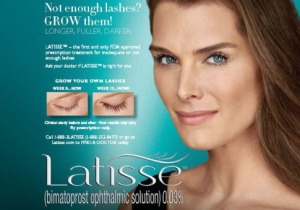 For example, actress Brooke Shields is a professional celebrity-for-hire (Volkswagen-Ford-Coppertone-LaZBoy-Colgate-Tupperware) and also spokeswoman for Latisse, a prescription eyelash thickening agent. Yes, there is such a thing. In September 2009, the FDA went after Latisse’s maker, Allergan, for a website that downplayed the drug’s serious risks which include cornea infections, hair growth outside of the treatment area, and permanent darkening of eye color.*