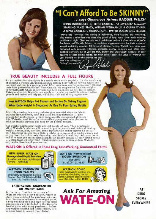 A 1965 ad for Wate-On, featuring legendary movie actress Raquel Welch (then a 25-year old starlet acting in her first film, “A Swingin’ Summer”):